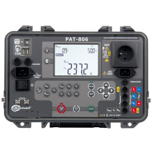 PAT-806 - цифровой прибор для контроля токов утечки и проверки параметров безопасности электрических устройств, применяемый как в промышленных условиях (сверлильные и точильно‑шлифовальные станки), так и в бытовых установках (холодильник, эл. печь); при этом производителем является Sonel S.A., что полезно учитывать при поиске сервисной информации и ПО.