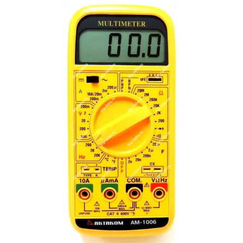 Измерение в частотном диапазоне 40 Гц...400 Гц: постоянного напряжения 100 мкВ...600 В, переменного напряжения 100 мкВ...600 В, постоянного тока 0,1 мкА...10 А, переменного тока 0,1 мкА...10 А, сопротивления 100 мОм...20 МОм, емкости 1 пФ...20 мкФ, частоты 0,1 Гц...20 кГц, температуры –20...+750 °C, коэффициента усиления транзисторов hFE, P-N тест, прозвонка цепи; базовая погрешность 0,5%; дополнительные функции: ЖКИ 3½, защита, ручное переключение диапазонов; питание 9 В, габариты 185х87х39 мм, масса 322 г
