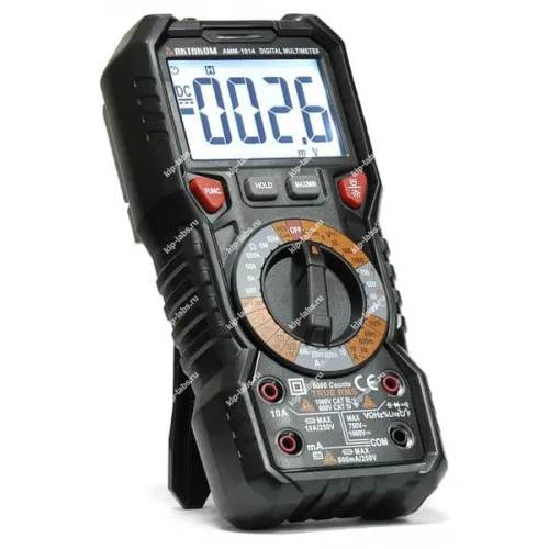 Мультиметр с расширенной функциональностью Актаком АММ-1014 имеет ЖК дисплей с яркой подсветкой и разрядностью 6000 отсчетов. Прибор имеет входной импеданс до 10 МОм и защиту на всех диапазонах 1000 В постоянного или 750 В переменного напряжения.