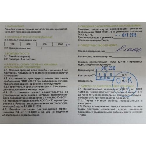 В комплекте поставки включены металлическая измерительная линейка длиной 100 см в соответствии с ГОСТ 427-75 и паспорт, содержащий клеймо о проведенной первичной поверке.
