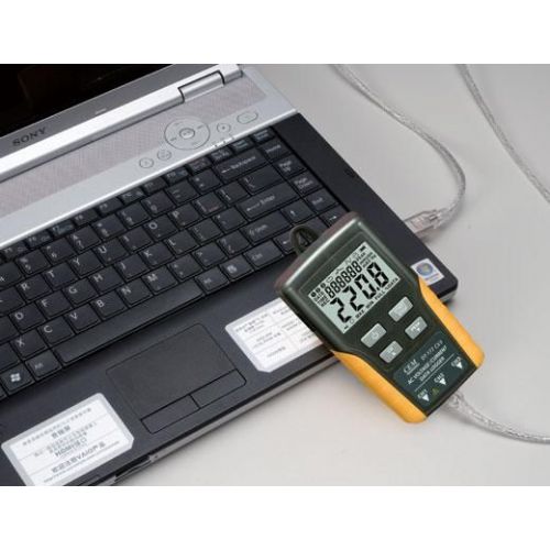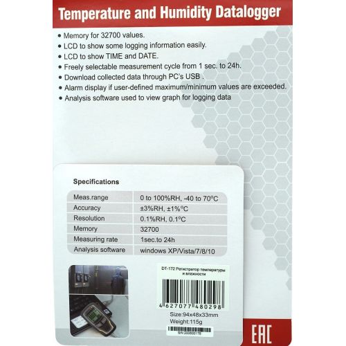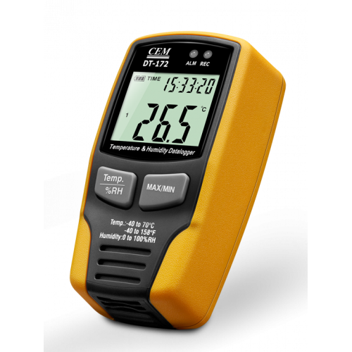 Информация сохраняется во встроенной памяти объемом 32700 записей (16350 температурных и 16350 записей влажности), что позволяет аккумулировать продолжительные серии измерений. Интервал регистрации задаётся от 1 сек. до 24 ч.; показания одновременно отображаются на крупном ЖК-дисплее, а прибор оповещает о превышении заданных границ и индицирует режим записи световыми индикаторами.