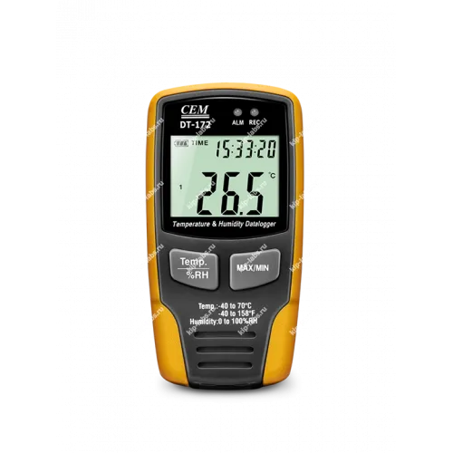 Устройство DT-172 представляет собой компактный регистратор, предназначенный для контроля температуры и влажности в помещениях и во внешней среде. Производитель — CEM Industries, что подтверждает профильность прибора для задач мониторинга.