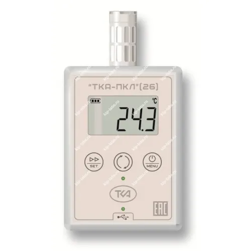 Устройство ТКА-ПКЛ (26)-Д служит для фиксации относительной влажности (RH, %), температуры (t, С) воздуха и значений атмосферного давления. Прибор поставляется производителем ТКА и предназначен для задач контроля микроклимата.