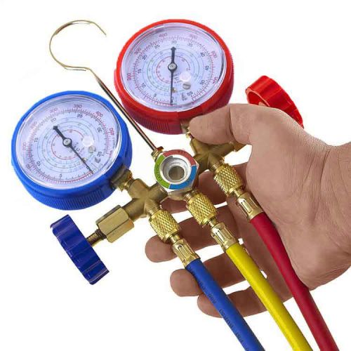 МЕГЕОН 51780 - манометрическая станция (коллектор), в конструкции которой присутствуют два манометра, 2 вентиля, три штуцера и смотровое окно; прибор рассчитан на полный цикл сервисных операций. Она позволяет одновременно контролировать давление в обоих контурах, проводить вакуумирование, заправку и дозаправку хладагентом, при этом на шкалах нанесены температуры кипения хладагентов R22, R134a, R404a и R410a для быстрого ориентирования. В комплект включены крючок для подвешивания и быстросъёмные муфты; при этом в ряде задач уместна дискретность показаний и потребность во внешней калибровке для привязки к эталону.