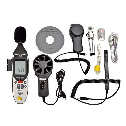 - Цифровой многофункциональный измеритель параметров окружающей среды 5 в 1 объединяет в себе функции шумомера, люксметра, гигрометра, термометра и термоанемометра в режимах CFM / CMM.