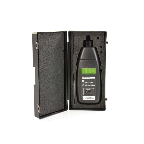Цифровой Тахометры (фотодатчик). Диапазон измерений от 5 до 99999 об/мин. Разрешение 0,1/1 об/мин. Погрешность 0,1%. Измерение на расстоянии от 50 до 150 мм. Питание: 4 х1,5 В (АА). Габариты: 190х72х37 мм, вес 235 г.