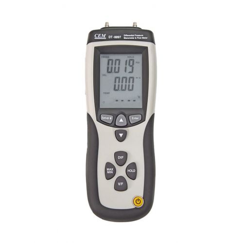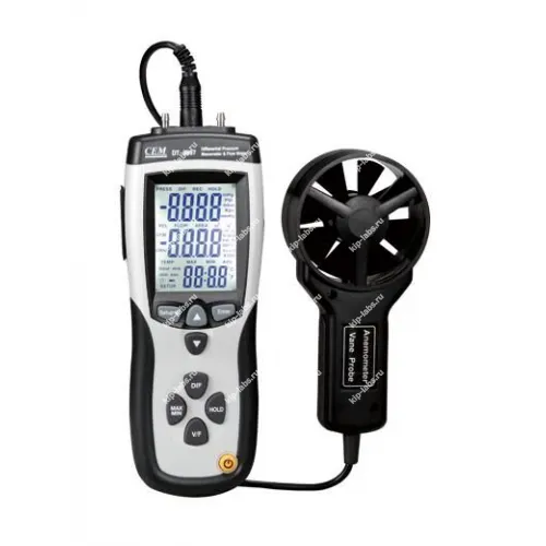 Прибор DT-8897 от CEM Industries представляет собой дифференциальный манометр, объединённый с анемометром и расходомером; он оборудован подсвечиваемым ЖК‑экраном, что позволяет фиксировать MIN/MAX/AVG с временными пометками и контролировать показания в условиях низкой освещённости.