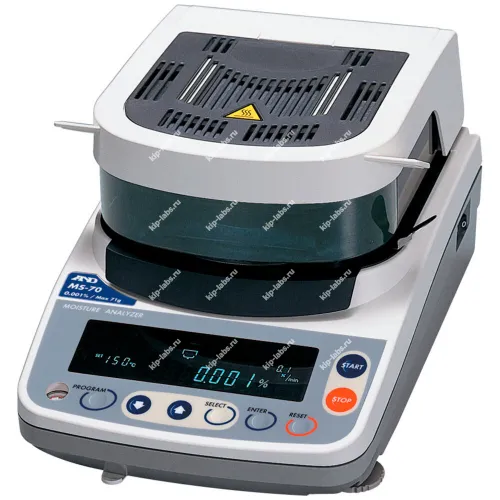 Анализатор влажности AND MS-70 произведён компанией AnD и служит для быстрого измерения влагосодержания продукции термографическим способом. Устройство объединяет аналитические весы с модулем сушки, при этом испарение влаги регистрируется при нагреве пробы.