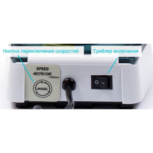 При включении (клавиша включения на задней панели) центрифуга начнёт работать на наименьшей скорости. Чтобы переключить скорость, нужно открыть крышку центрифуги, а затем нажать левую кнопку на задней панели. Скорость будет изменяться последовательно: 4000, 7200, 10 000 об/мин и так по кругу.