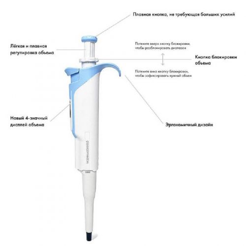 - Блокировка объёма осуществляется одним щелчком. Это помогает предотвратить ошибки пипетирования, вызванные случайными изменениями объёма, что позволяет более точно перекачивать небольшие объёмы жидкостей.