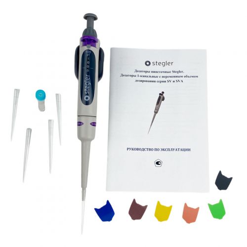 Кратко о модели: Одноканальный дозатор переменного объёма Stegler SV-1-10-100 (10-100 мкл, частично автоклавируемый)