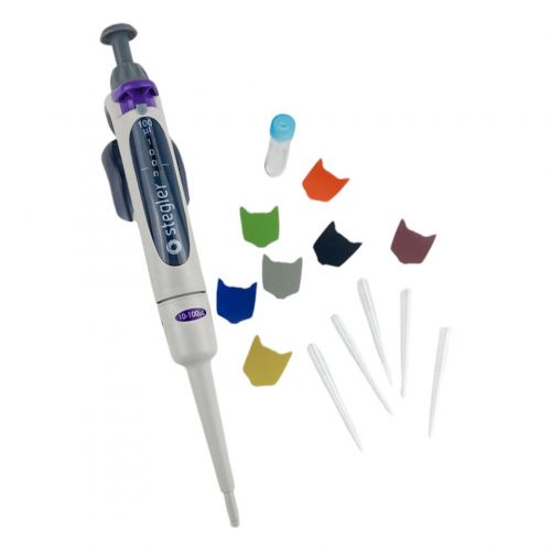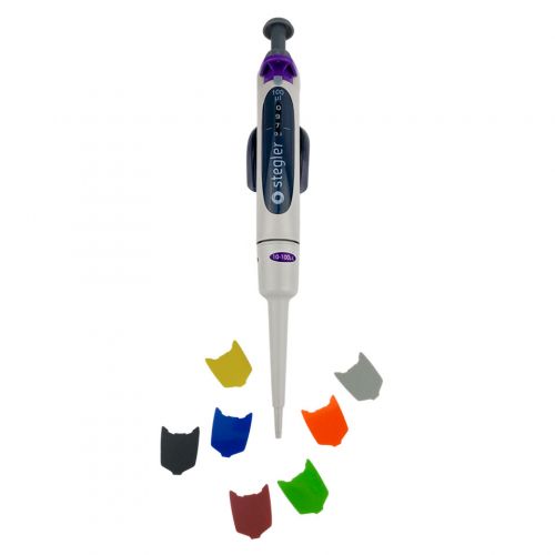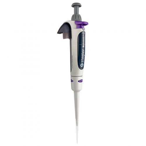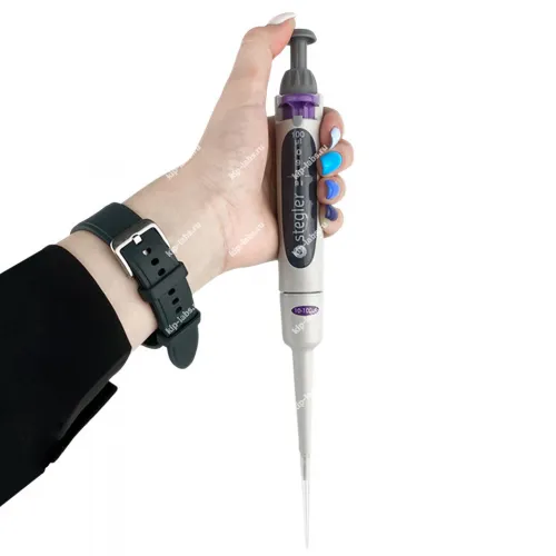 Stegler SVA-1-10-100 — это одноканальный пипеточный механический дозатор с переменным объёмом дозирования. Он работает по принципу воздушной подушки: отмеряемая жидкость всасывается в одноразовый наконечник, предварительно одетый на дозатор, не соприкасаясь с валом или плунжером дозатора.