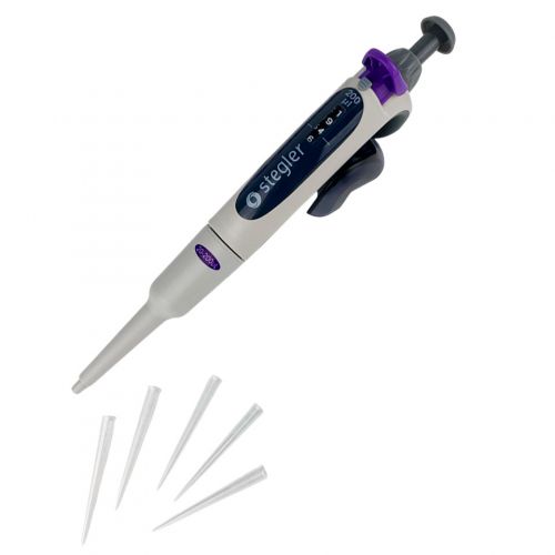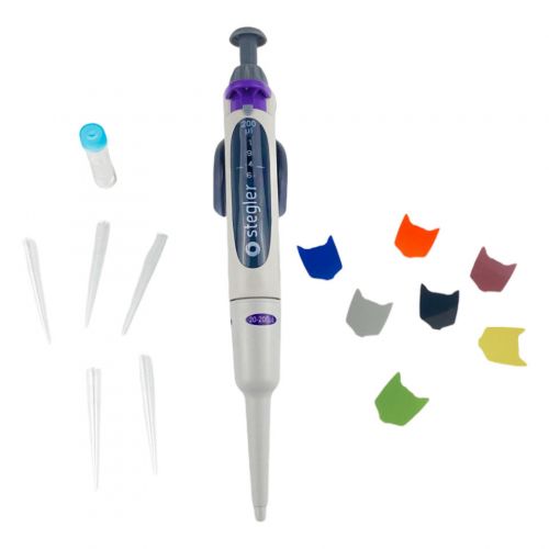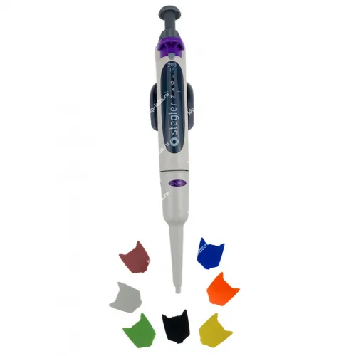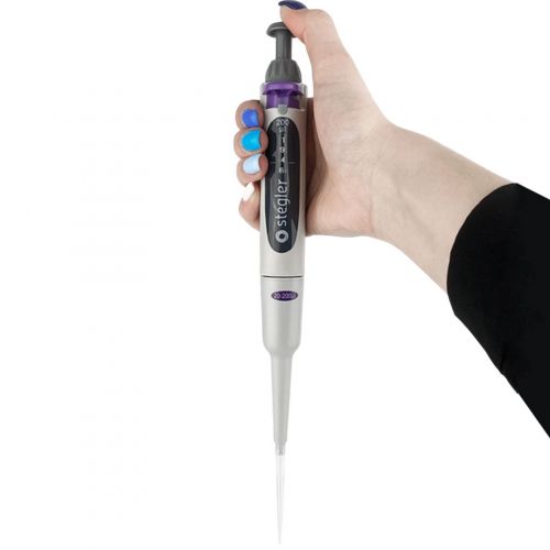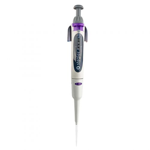 Stegler SVA-1-20-200 — это одноканальный пипеточный механический дозатор с переменным объёмом дозирования. Он работает по принципу воздушной подушки: отмеряемая жидкость всасывается в одноразовый наконечник, предварительно одетый на дозатор, не соприкасаясь свалом или плунжером дозатора.