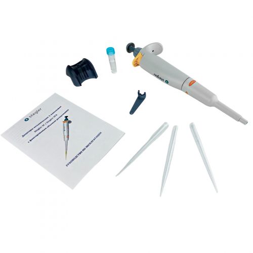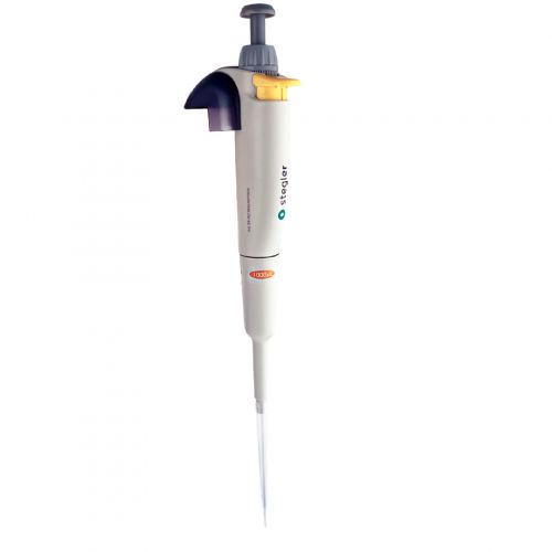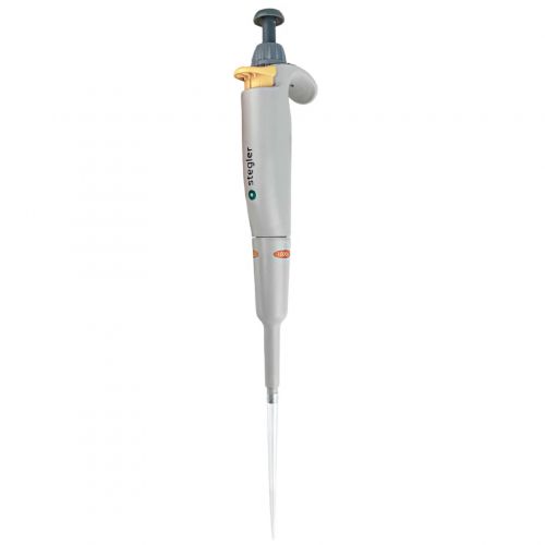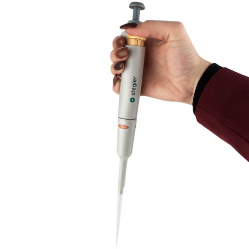 Stegler SFA-1-1000 - механический одноканальный пипеточный дозатор с фиксированным объёмом 1000 мкл, при этом его рабочий принцип основан на воздушной подушке: отмеряемая жидкость попадает в одноразовый наконечник, надетый на дозатор, без соприкосновения с валом или плунжером.