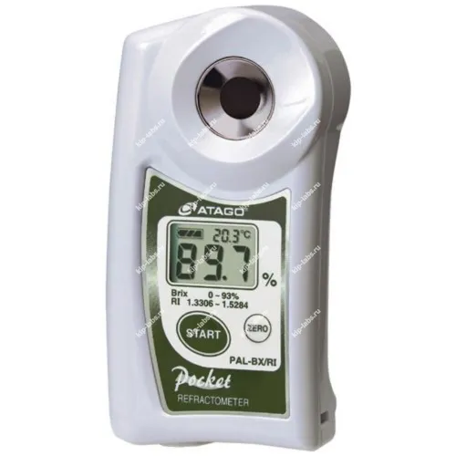 Модель PAL-BX/RI от ATAGO представляет собой портативный рефрактометр с двойной индикацией: шкалой Brix в диапазоне 0,0 до 93,0% Brix с точностью ±0,1% и шкалой коэффициента преломления RI с погрешностью ±0,0003; при этом на дисплее одновременно выводятся значение nD и температура пробы.