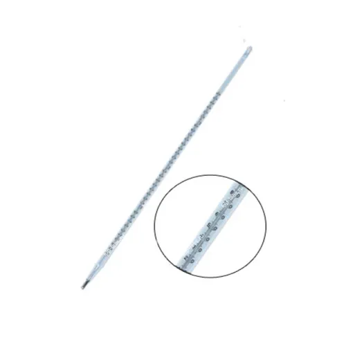 Корпус изготовлен из стекла и содержит внутреннюю шкальную пластину, что упрощает считывание показаний. Вершина термометра оснащена шариком диаметром 6 мм, предназначенным для удержания прибора.