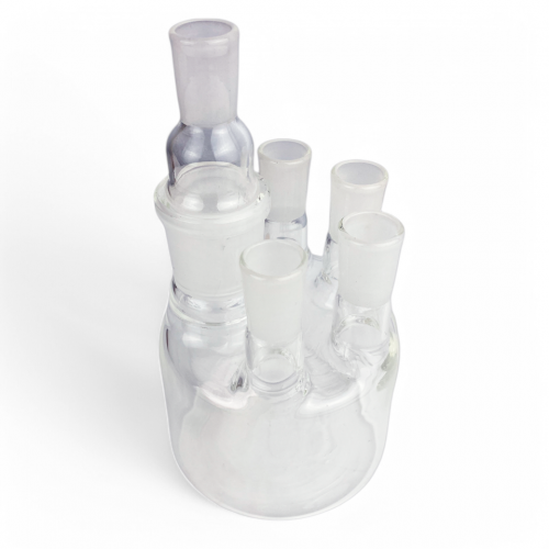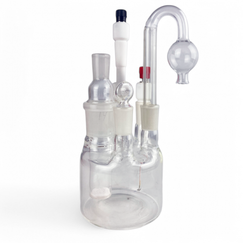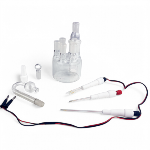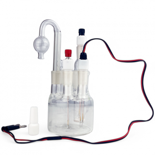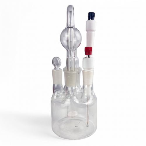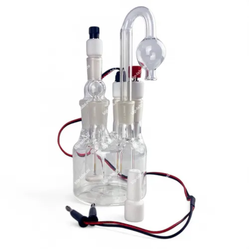 Корпус выполнен из затемненного стекла, что снижает влияние света на реагенты и повышает стабильность фона. Предусмотрены отдельные горловины для установки хлор-кальциевой трубки, ввода пробы, монтажа генераторных электродов и бипотенциометрической индикаторной системы, а также отдельная горловина для катодной камеры. Такое раздельное подключение уменьшает риск перекрестного загрязнения и облегчает работу оператора.