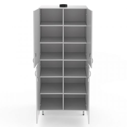 В шкафу расположены восемь полок-вкладышей, по две в верхнем и нижнем отсеке в каждой секции. Эти полки можно повесить на удобную высоту. Центральная полка служит ребром жёсткости, и её положение изменить нельзя.