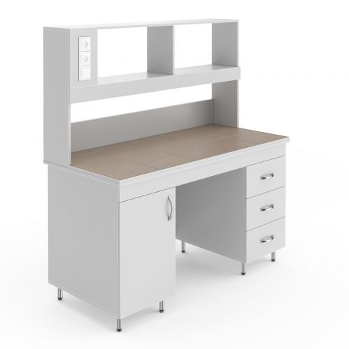 НВ-1500 ПК — это большой пристенный стол с надстройкой. Столешница глубиной 70 см. В надстройку встроена лампа и две розетки. Предназначен для работы стоя: высота от пола до столешница равна 85 см.