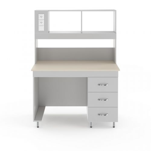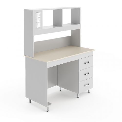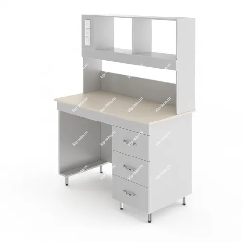 Справа под столешницей располагается встроенная тумба с тремя выдвижными ящиками. В них можно хранить лабораторную посуду, аксессуары к оборудованию или другие мелочи.