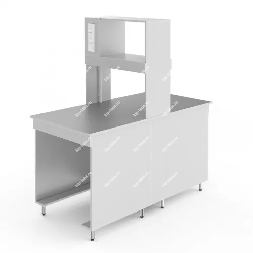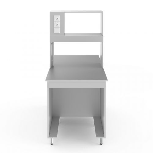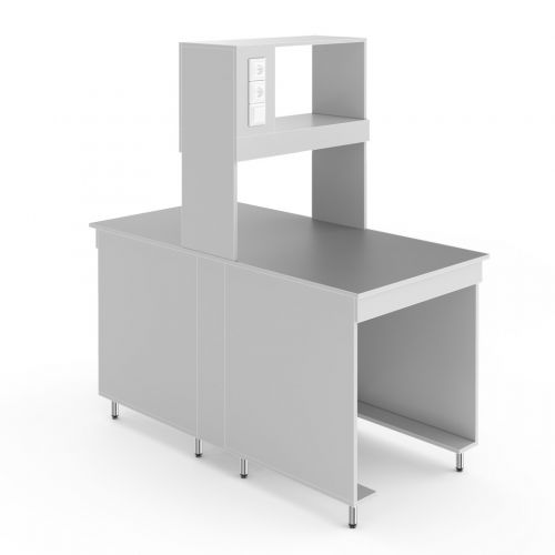 НВ-800 ОСП — это компактный островной стол с надстройкой. Его можно поставить в центре лаборатории и организовать два рабочих места. Столешница глубиной 152 см. В надстройку с каждой стороны встроена лампа и две розетки. Предназначен для работы стоя: высота от пола до столешница равна 85 см.