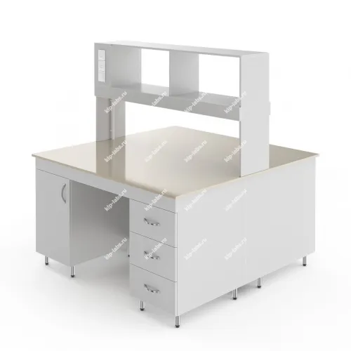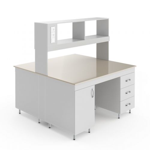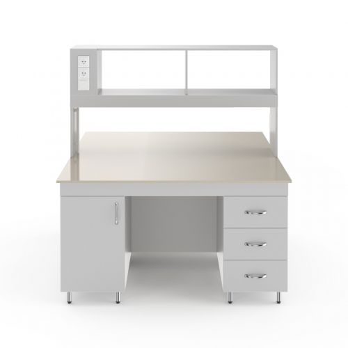 НВ-1500 ОП — это большой островной стол с надстройкой. Его можно поставить в центре лаборатории и организовать два полноценных рабочих места. Столешница глубиной 152 см. В надстройку с каждой стороны встроена лампа и две розетки. Предназначен для работы стоя: высота от пола до столешница равна 85 см.