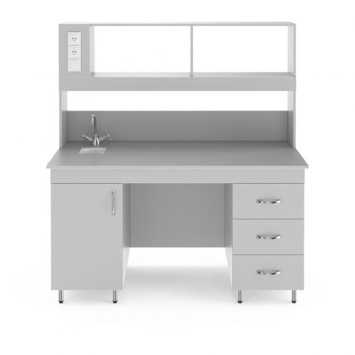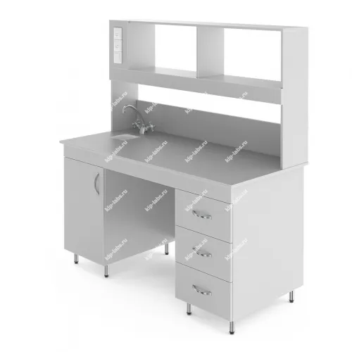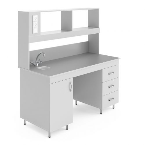 НВ-1500 ПСПХ — это большой пристенный стол с сантехникой и надстройкой. Столешница глубиной 70 см. В надстройку встроена лампа и две розетки. Предназначен для работы стоя: высота от пола до столешница равна 85 см.