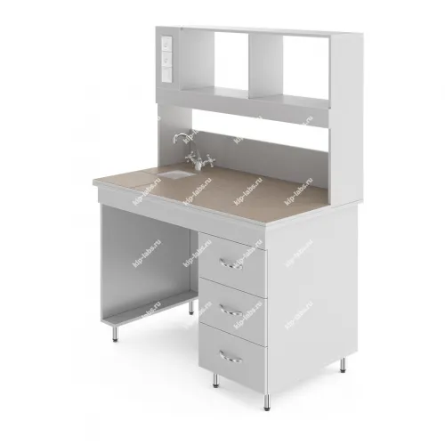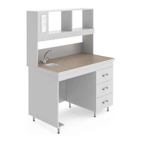 НВ-1200 ПКХ — это пристенный стол с сантехникой и надстройкой. Столешница глубиной 70 см. В надстройку встроена лампа и две розетки. Предназначен для работы стоя: высота от пола до столешница равна 85 см.