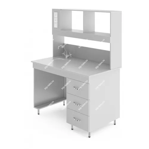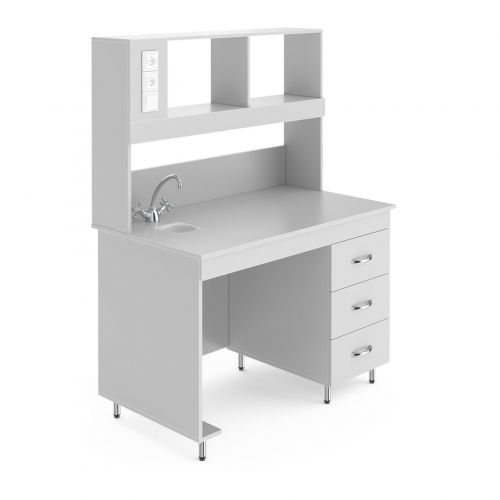 НВ-1200 ПЛХ — это небольшой пристенный стол с сантехникой и надстройкой. Столешница глубиной 70 см. В надстройку встроена лампа и две розетки. Предназначен для работы стоя: высота от пола до столешница равна 85 см.