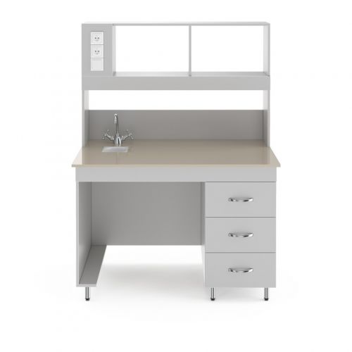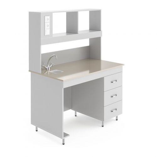 НВ-1200 ППХ — это небольшой пристенный стол с сантехникой и надстройкой. Столешница глубиной 70 см. В надстройку встроена лампа и две розетки. Предназначен для работы стоя: высота от пола до столешница равна 85 см.