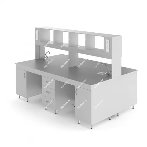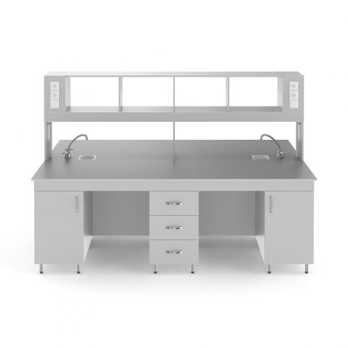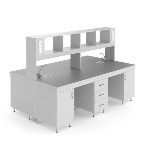 НВ-2400 ОСПХ — это самый большой островной стол с надстройкой и сантехникой в серии «НВ». Его можно поставить в центре лаборатории и организовать два полноценных рабочих места. Столешница глубиной 152 см. В надстройку с каждой стороны встроена лампа и две розетки. Предназначен для работы стоя: высота от пола до столешница равна 85 см.