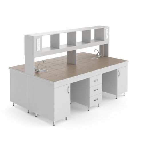 НВ-2400 ОКХ — это самый большой островной стол с надстройкой и сантехникой в серии «НВ». Его можно поставить в центре лаборатории и организовать четыре полноценных рабочих места. Столешница глубиной 152 см. В надстройку с каждой стороны встроена лампа и две розетки. Предназначен для работы стоя: высота от пола до столешница равна 85 см.