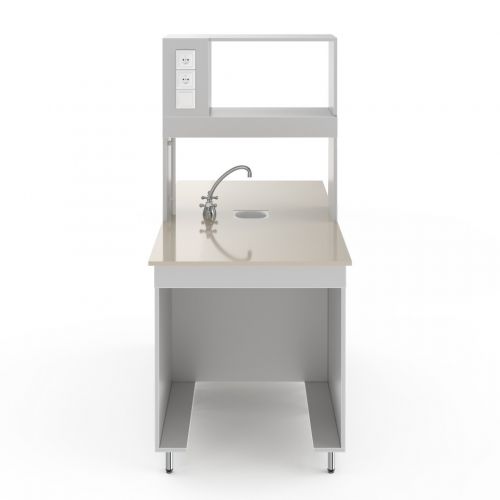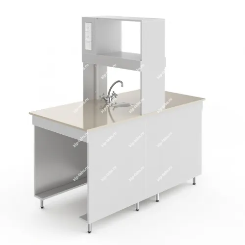 НВ-800 ОПХ — это компактный островной стол с сантехникой и надстройкой. Его можно поставить в центре лаборатории и организовать два рабочих места. Столешница глубиной 152 см. В надстройку с каждой стороны встроена лампа и две розетки. Предназначен для работы стоя: высота от пола до столешница равна 85 см.