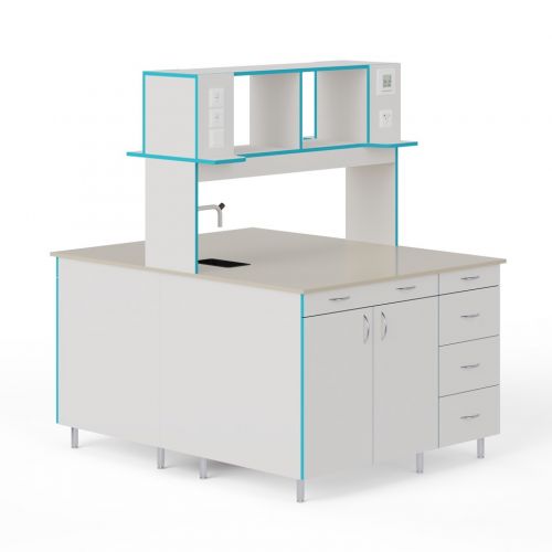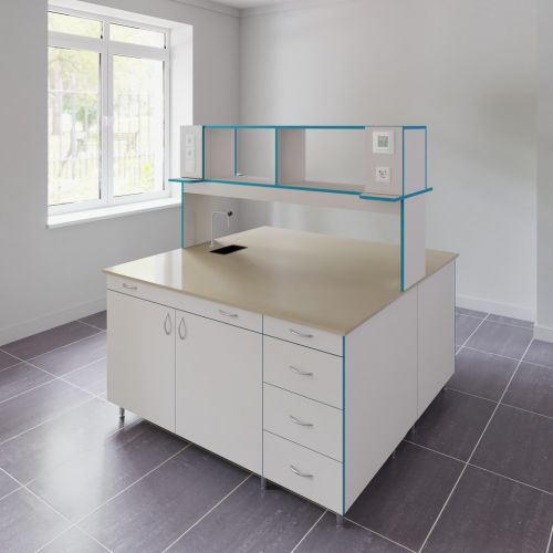 СЛО НВК 1200 ПП+ — это большой лабораторный островной стол шириной 1218 мм с надстройкой и с сантехникой. Стол для работы стоя: высота от пола до столешница равна 85 см.