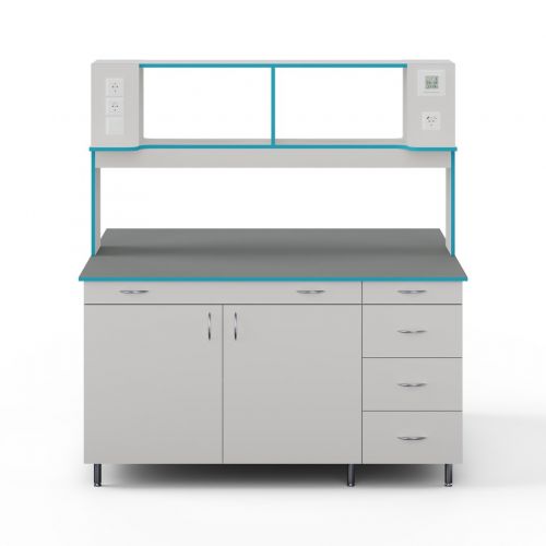 Материал рабочей поверхности: химически стойкий пластик. Он влагостоек, устойчив к длительному воздействию концентрированных кислот и щелочей. Ограниченно стоек к высокой температуре и к длительному воздействию органических растворителей. Популярный выбор для лабораторий, подходит для учебных практикумов, аналитических и медицинских лабораторий. На такую столешницу не следует ставить печи или сушильные шкафы.