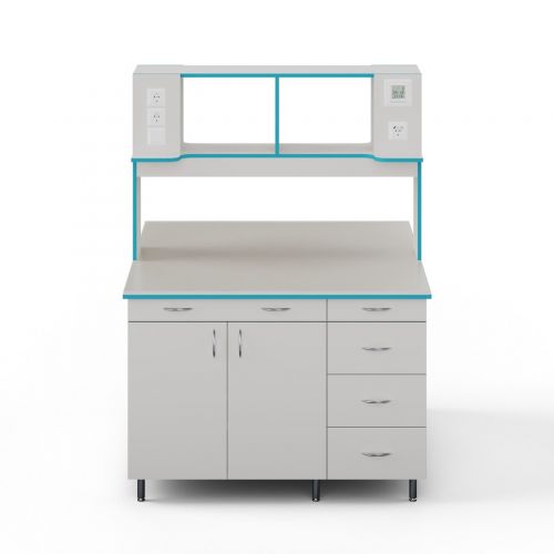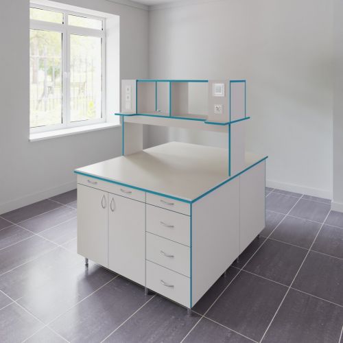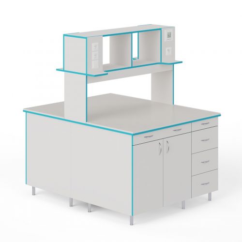 СЛО НВК 1200 МОН — это большой лабораторный островной стол шириной 1218 мм с надстройкой и без сантехники. Стол для работы стоя: высота от пола до столешница равна 85 см.