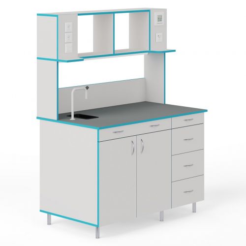 СЛП НВК 1200 ПЛАСТ+ — это лабораторный пристенный стол шириной 1218 мм с надстройкой и с сантехникой. В надстройку встроена лампа и розетки. Стол для работы стоя: высота от пола до столешница равна 85 см.