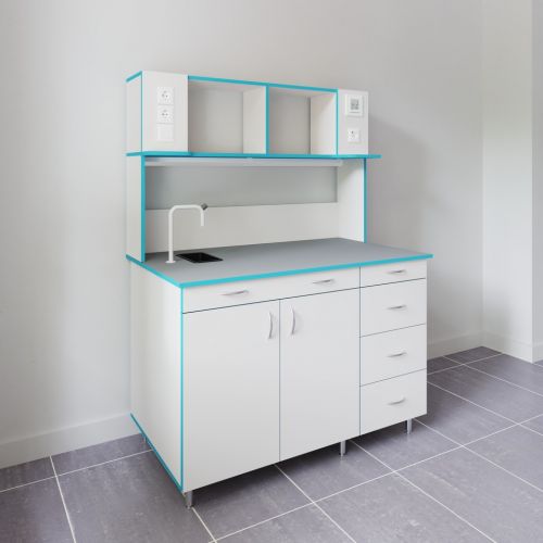 Материал рабочей поверхности: химически стойкий пластик. Он влагостоек, устойчив к длительному воздействию концентрированных кислот и щелочей. Ограниченно стоек к высокой температуре и к длительному воздействию органических растворителей. Популярный выбор для лабораторий, подходит для учебных практикумов, аналитических и медицинских лабораторий. На такую столешницу не следует ставить печи или сушильные шкафы.