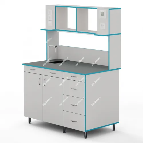 Стол оснащён полипропиленовой раковиной и латунным краном с полипропиленовым напылением. Полипропилен устойчив к продолжительному воздействию концентрированных кислот, щелочей и органических растворителей. Глубина раковины: 122 мм.