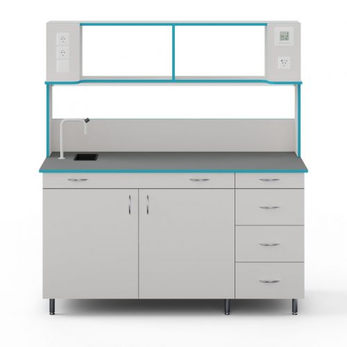 СЛП НВК 1500 ПЛАСТ+ — это лабораторный пристенный стол шириной 1520 мм с надстройкой и с сантехникой. В надстройку встроена лампа и розетки. Стол для работы стоя: высота от пола до столешница равна 85 см.