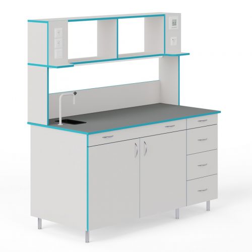 Пристенный лабораторный стол с надстройкой, сантехникой и столешницей из химически стойкого пластика СЛП НВК 1500 ПЛАСТ+