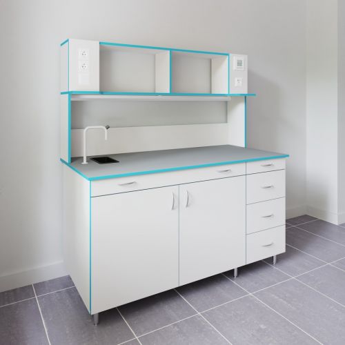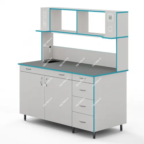 Материал рабочей поверхности: химически стойкий пластик. Он влагостоек, устойчив к длительному воздействию концентрированных кислот и щелочей. Ограниченно стоек к высокой температуре и к длительному воздействию органических растворителей. Популярный выбор для лабораторий, подходит для учебных практикумов, аналитических и медицинских лабораторий. На такую столешницу не следует ставить печи или сушильные шкафы.
