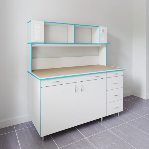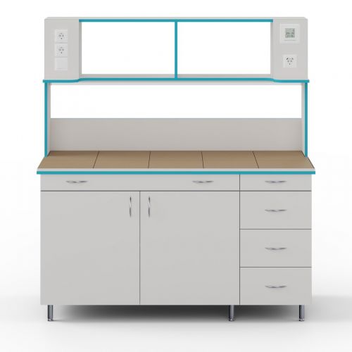 Столешница выполнена из керамогранитной плитки. Плитка влагостойка и отлично выдерживает высокие температуры. Можно ставить сушильные шкафы, бани и другие нагревательные приборы. Устойчива к продолжительному воздействию концентрированных кислот, щелочей и органических растворителей. Ограниченно стойка к плавиковой кислоте. Это один из самых популярных видов материалов столешниц для лабораторной мебели, и такой стол подойдет для большинства химических, биологических, медицинских лабораторий и практикумов.