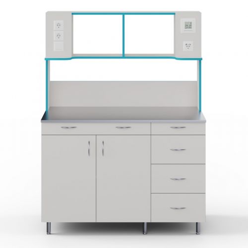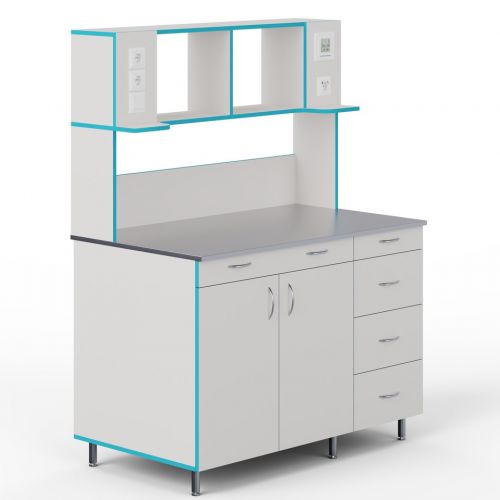 СЛП НВК 1200 НЕРЖ — это лабораторный пристенный стол шириной 1218 мм с надстройкой и без сантехники. В надстройку встроена лампа и розетки. Стол для работы стоя: высота от пола до столешница равна 85 см.