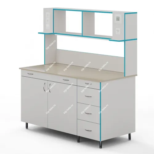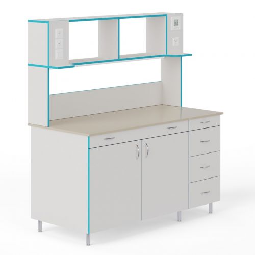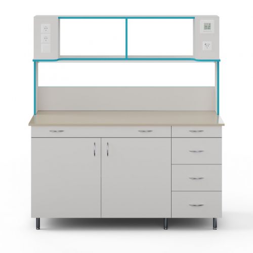 СЛП НВК 1500 ПП — это лабораторный пристенный стол шириной 1520 мм с надстройкой и без сантехники. В надстройку встроена лампа и розетки. Стол для работы стоя: высота от пола до столешница равна 85 см.