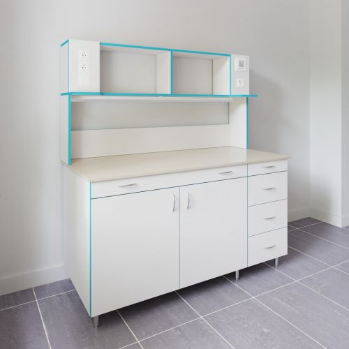 Столешница выполнена из полипропилена. Это специализированное решение для химических лабораторий, работающих с неорганическими растворителями. Монолитный полипропилен влагостоек, устойчив к длительному воздействию концентрированных кислот, щелочей и органических растворителей. Плохо устойчив к воздействию высоких температур.