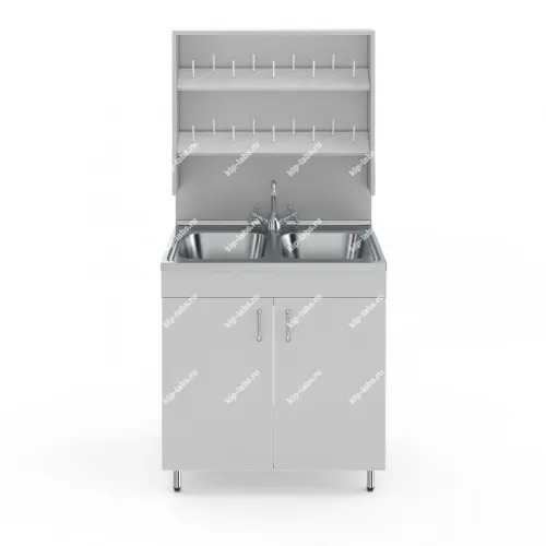 НВ-800 МД — это стол с двумя мойками из нержавеющей стали и с пластиковой сушилкой на 18 мест. Предназначен для работы стоя: высота до столешницы 85 см.