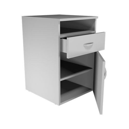 Выдвижной ящик установлен на роликовых направляющих, что позволяет обеспечить плавное и лёгкое выдвижение; за счёт распашной дверцы обеспечивается удобный доступ к внутреннему объёму и полке-вкладышу.