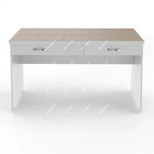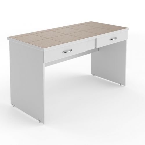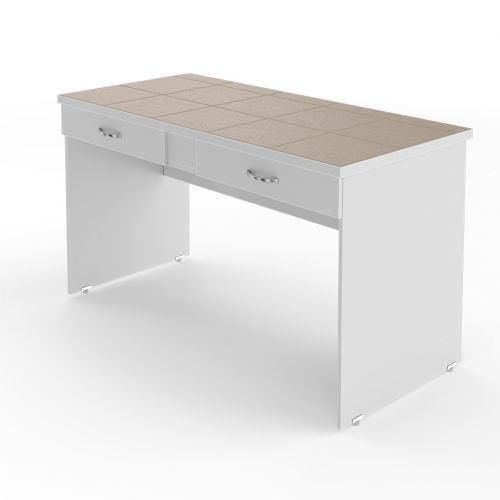 Столешница выполнена из керамогранитной плитки. Плитка влагостойка и отлично выдерживает высокие температуры. Устойчива к продолжительному воздействию концентрированных кислот, щелочей и органических растворителей. Ограниченно стойка к плавиковой кислоте. Это один из самых популярных видов материалов столешниц для лабораторной мебели.