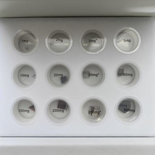 - Диапазон номиналов 1 мг — 500 мг. Наличие микромасс разных значений позволяет формировать требуемые комбинации для настройки и проверки чувствительности лабораторных весов.
